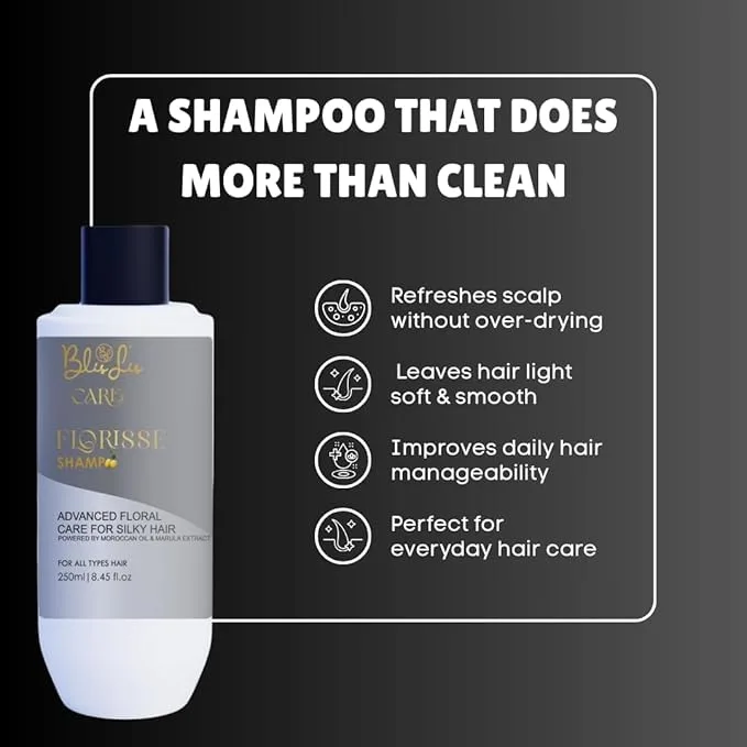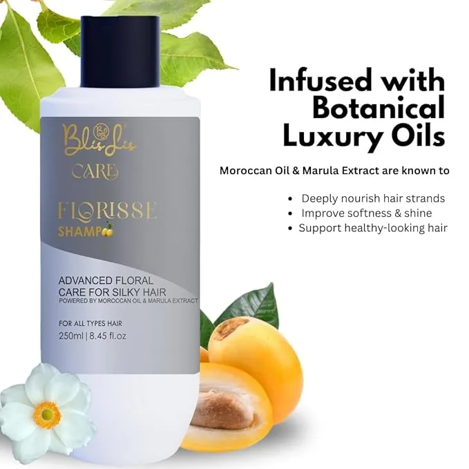 Blislis Florisse is the best shampoo for silky hair, enriched with Moroccan Oil and Marula Extract to deeply nourish and restore shine. It reduces frizz, improves softness, and leaves hair smooth, manageable, and beautifully silky after every wash.